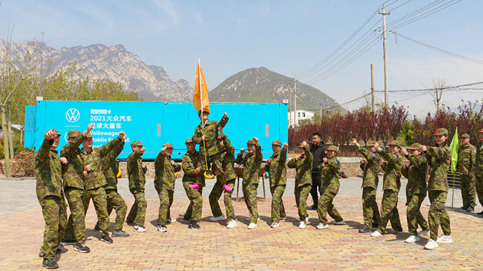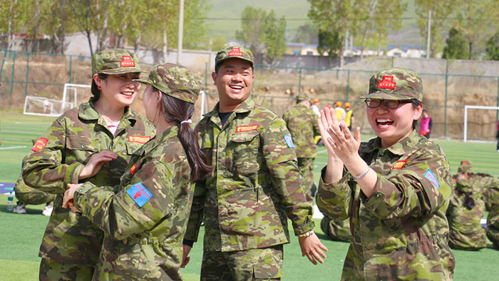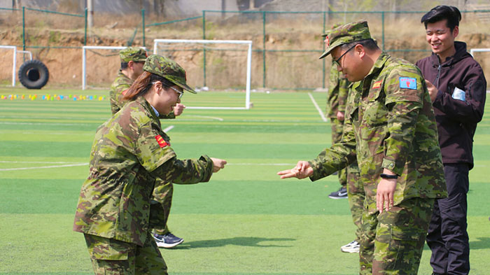 開訓前,在破冰啟航環節——【智勇通關】項目中,每組選一個大魔王來防守別隊,該隊隊員依次挑戰大魔王,石頭剪刀布定輸贏,贏了直接通過,輸了轉一圈,回來接著挑戰,再輸即增加圈數,直到全部隊員通過。大家把團隊當成了自己的“城堡”,在“對抗魔王”中,每個隊員都拼盡全力,期待被幸運女神光顧,期待團隊能盡早完成任務,大家的歡笑聲、喝彩聲灑滿了訓練場。