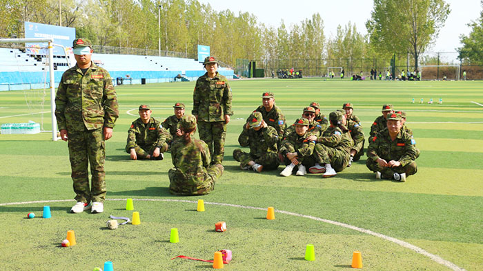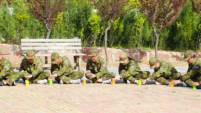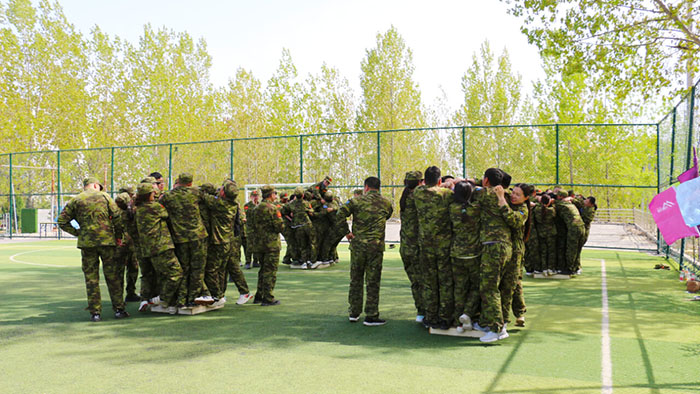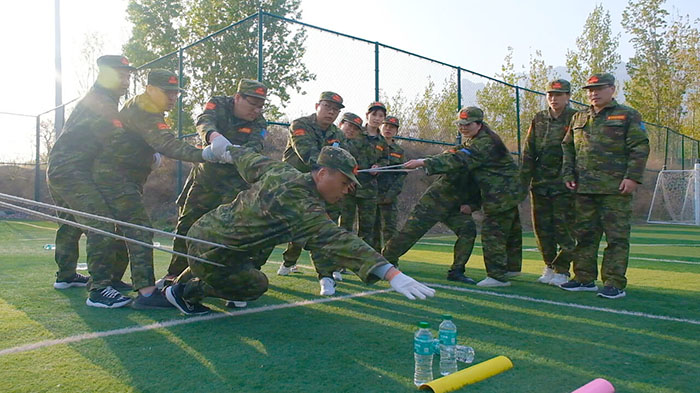 在【沙場點兵】項目,要求每個隊選出一個總指揮做將軍,一個協調者做軍師,剩余伙伴作為士兵。設定將軍起著總指揮的作用,但無法看見戰場的具體情況,其命令需由軍師來傳達。而軍師則只能用肢體語言告訴將軍該如何部署,士兵們則需要蒙著眼睛聽將軍命令,從而實現在沙場前進、攻擊。當規則定好,每個人所要做的就是各司其職。有人規劃部署,有人上傳下達,有人依命令行事,雖然有理解錯誤、聽錯命令的情況發生,大家還是玩得不亦樂乎。在這個項目中,大家感悟到正確溝通的重要性。
