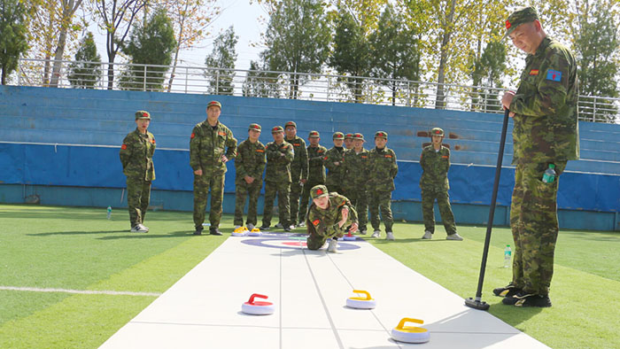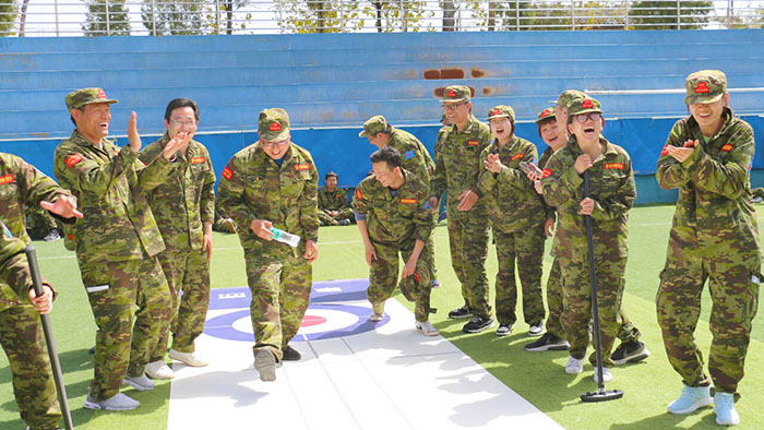 在【旱地冰壺】項目中,八個小組的隊員們一邊商榷對敵戰術,一邊進行任務分配。隨著一聲哨響,兩個賽隊同時開賽。隊員們全神貫注、凝神靜氣,向前邁步沖刺,揮動手臂擲壺,冰壺按照隊員們設想的路線擊打到對方的冰壺,使其滑出得分圈并穩穩地停留在中心點,成功得分,大家歡呼雀躍,圍觀隊員們也紛紛叫好,掌聲、歡呼聲此起彼伏,好不熱鬧。