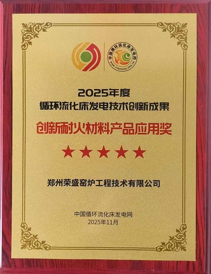 在本次大會上,鄭州榮盛窯爐工程技術有限公司憑借其在耐火材料產品研發(fā)與應用方面的良好表現(xiàn),榮獲2025年度循環(huán)流化床發(fā)電技術創(chuàng)新成果“創(chuàng)新耐火材料產品應用獎”。該獎項是對公司在循環(huán)流化床鍋爐耐火材料領域持續(xù)創(chuàng)新、技術突破與產業(yè)化應用成果的權威認可。
