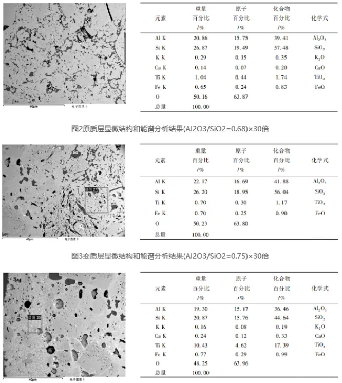 從熱力學上看,Al₂O₃-SiO₂系材料[4]各物相在氯化反應中:莫來石相(A₃S₂)非常不穩(wěn)定,其成份見表2,石英相(SiO₂)非常穩(wěn)定,剛玉相(Al₂O₃)居中;在碳熱還原中:石英相非常不穩(wěn)定,剛玉相非常穩(wěn)定,莫來石相居中。在實際中,爐襯材料是如何損壞的,其過程是怎樣發(fā)生的,這要從殘磚顯微結構分析入手。